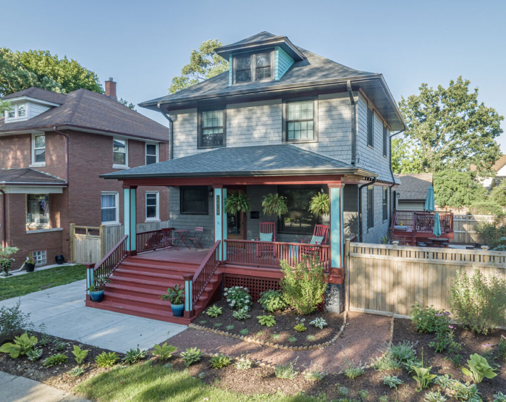 The home’s architectural style can best be described as American Four Square, and it retains many of the original materials that were used for the home’s exterior – including wood shingles that flare out between the first and second floors to accentuate the wide dental moulding detail that adorns all but its façade. The current owners spent more than two years renovating the interior and exterior, saving or reproducing original details and pieces where they could, and beautifully melding their eclectic style into the design – resulting in what we feel is a successful partial restoration, partial modernization of the home.